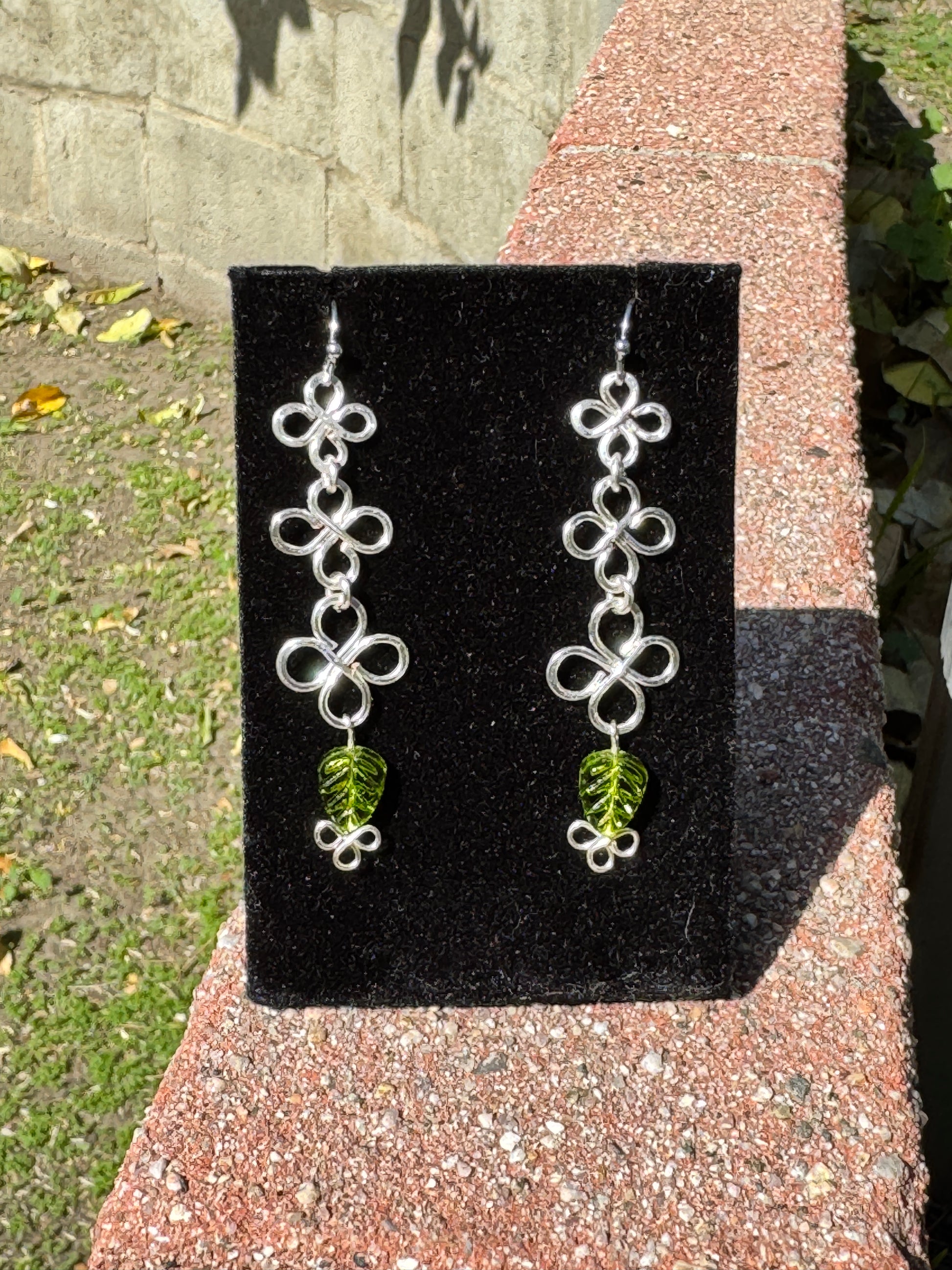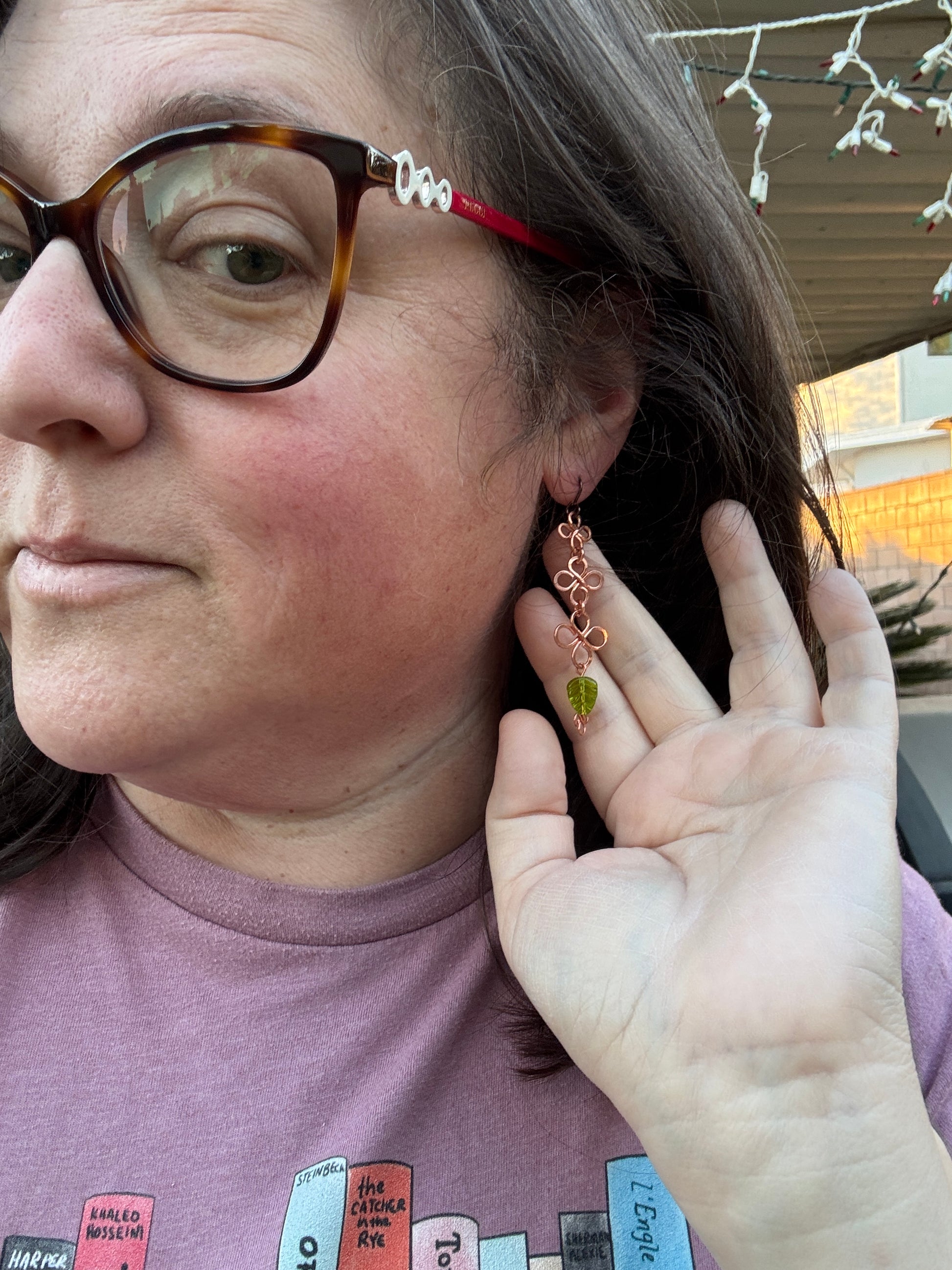 Graceful and nature-inspired, these earrings feature three hand-wrapped clove links in a cascading design, finished with a green glass leaf bead. Available in raw copper for an earthy feel or silver-plated copper for a sleek touch. Lightweight and effortlessly elegant!