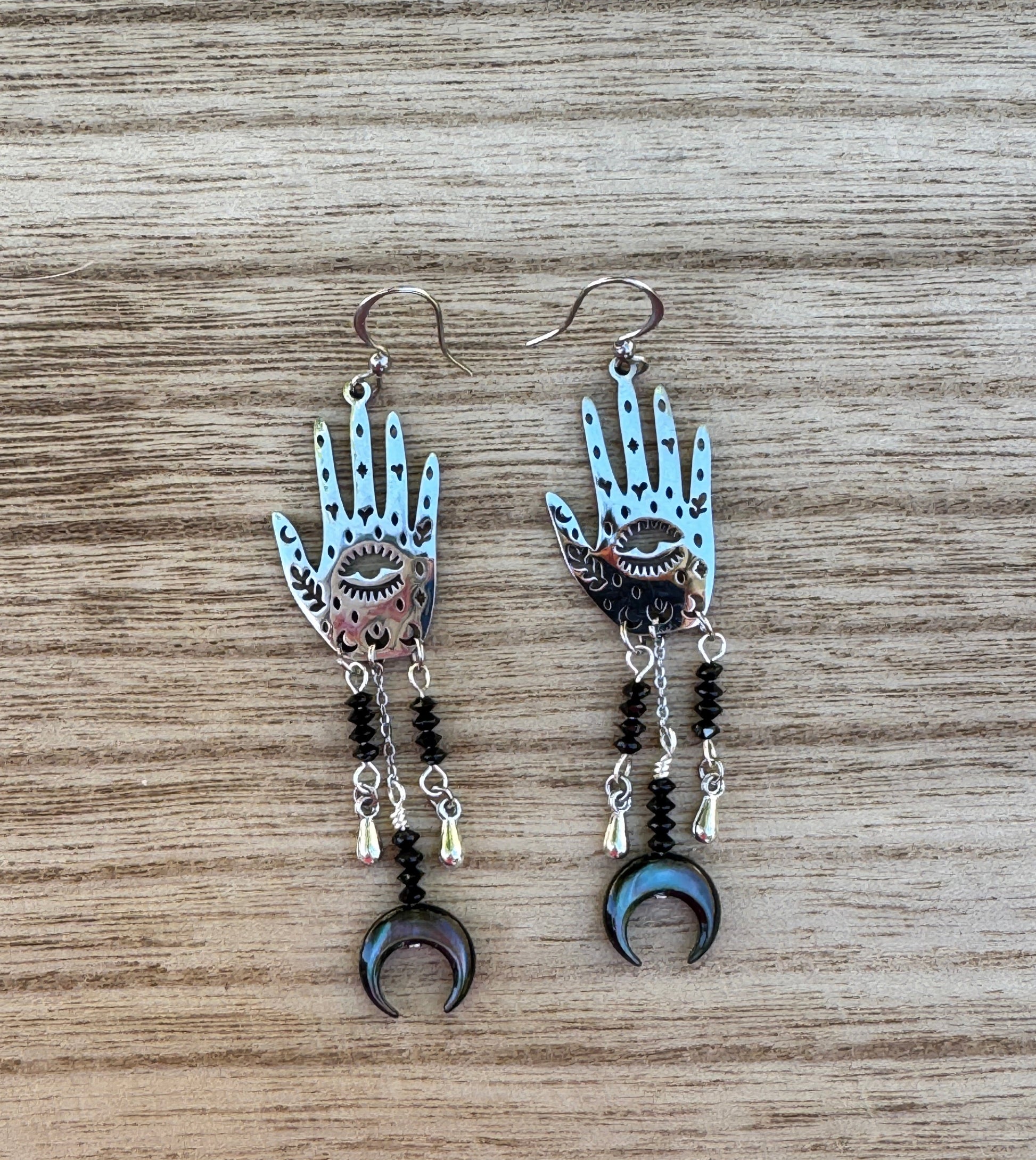 Channel your inner cosmic goddess with our Celestial Mother Earrings. Crafted with silver plated celestial tarot hands, accented with black spinel beads and black lip shell crescent moons, these earrings exude an air of mystique and elegance. Embrace the celestial energy and elevate your style with these unique statement pieces.