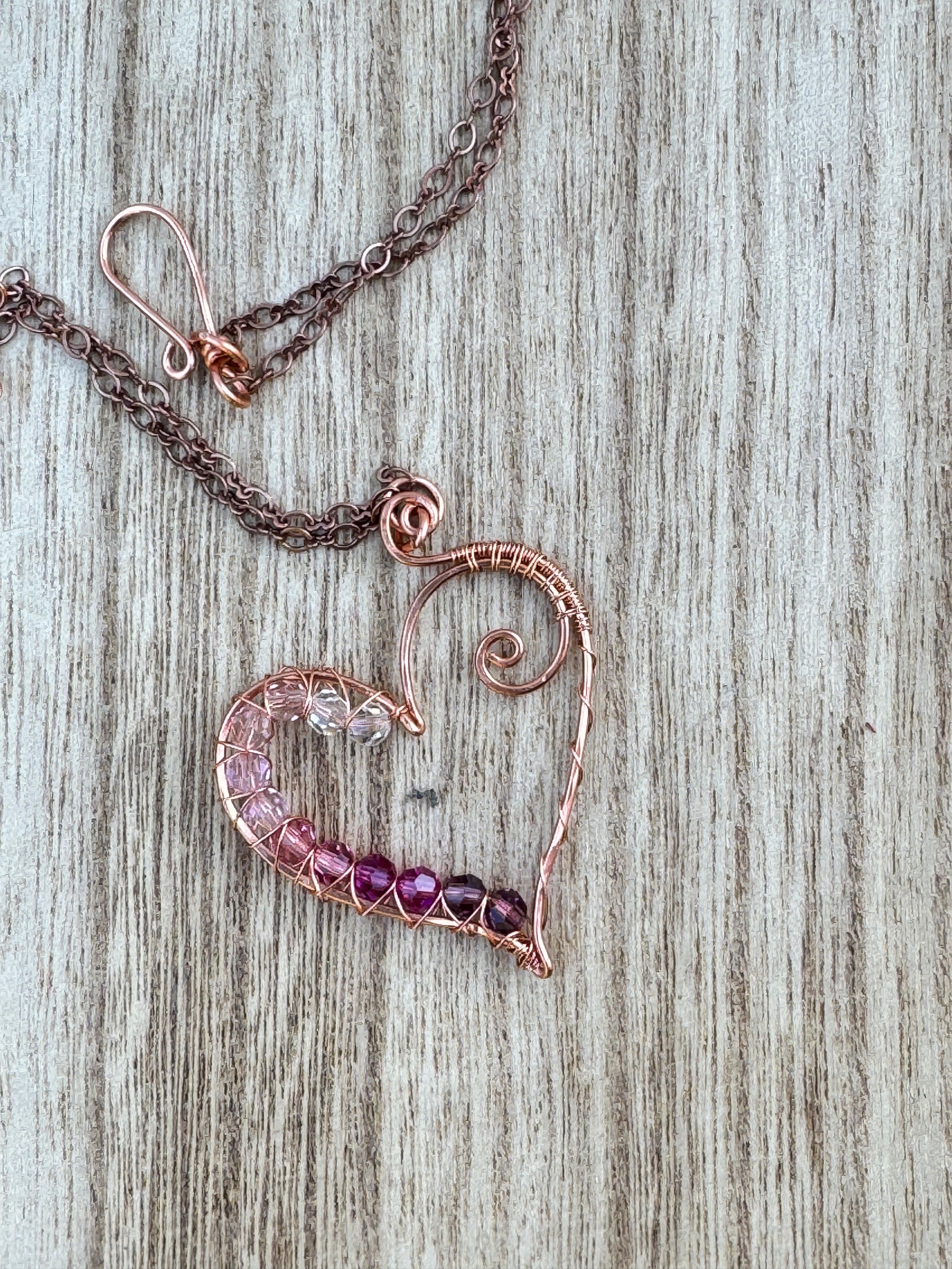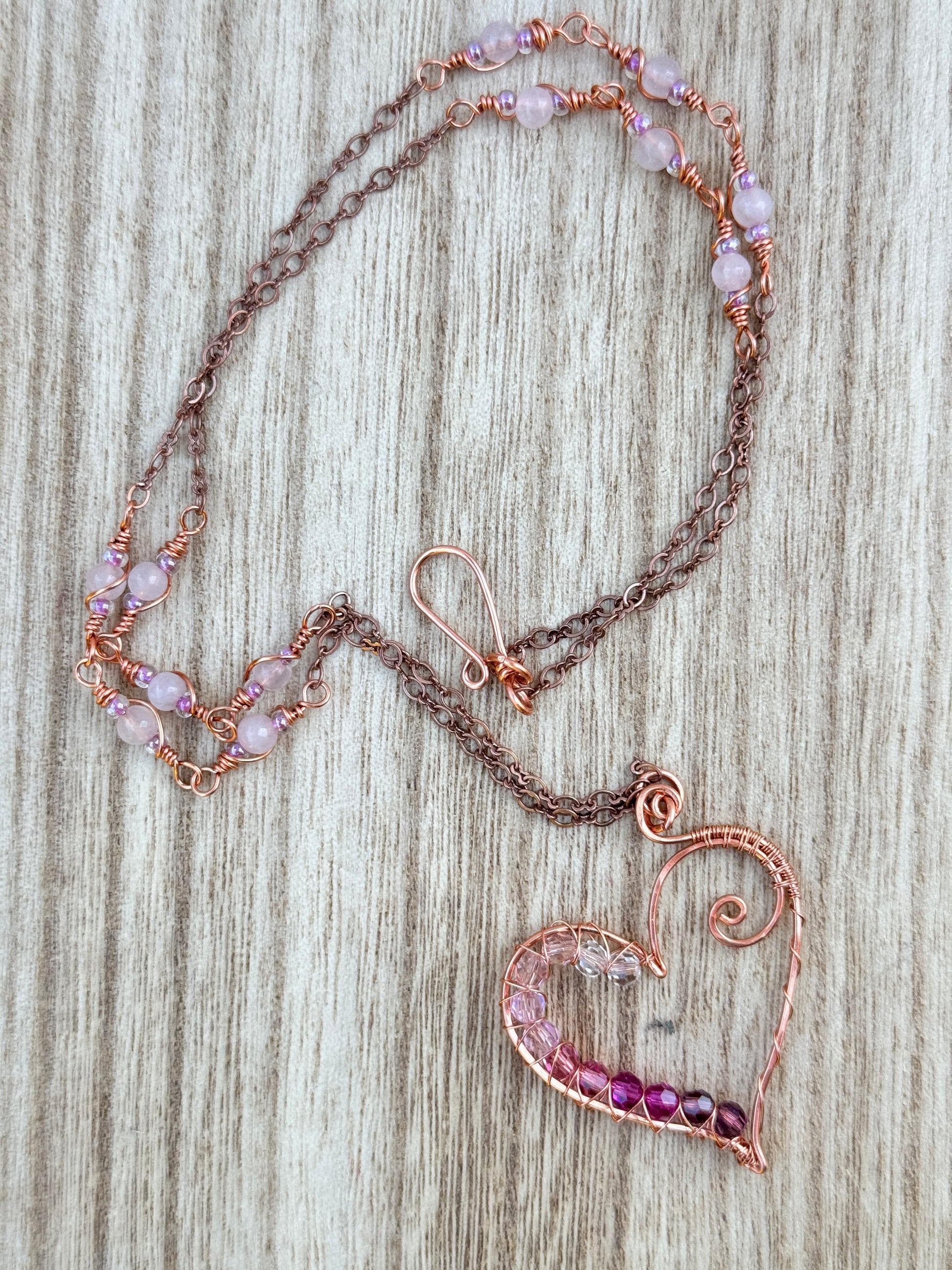 Add a touch of whimsy to your style with our hand wired Crystal Heart Necklace. Each piece is unique, wire-wrapped with copper wire and adorned with sparkling Czech crystals and natural rose quartz. A perfect accessory for any occasion!