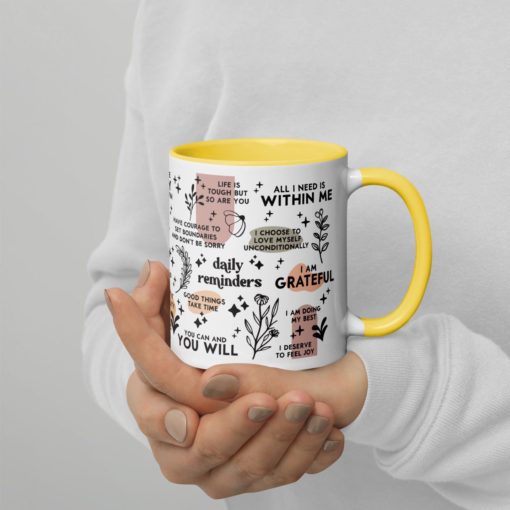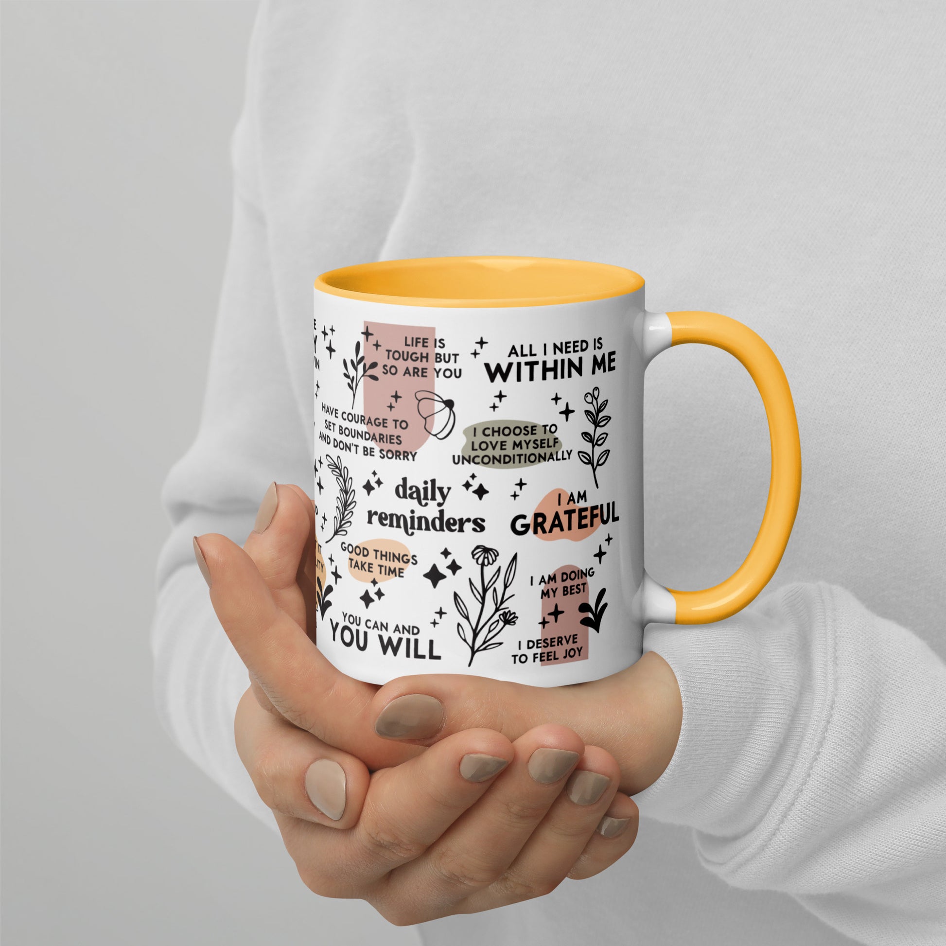 Start your day off right with this cheerful ceramic mug! It features a colorful handle and interior, and is designed with uplifting daily affirmations to make every sip more meaningful. Perfect for those days when you need a bit of extra comfort.