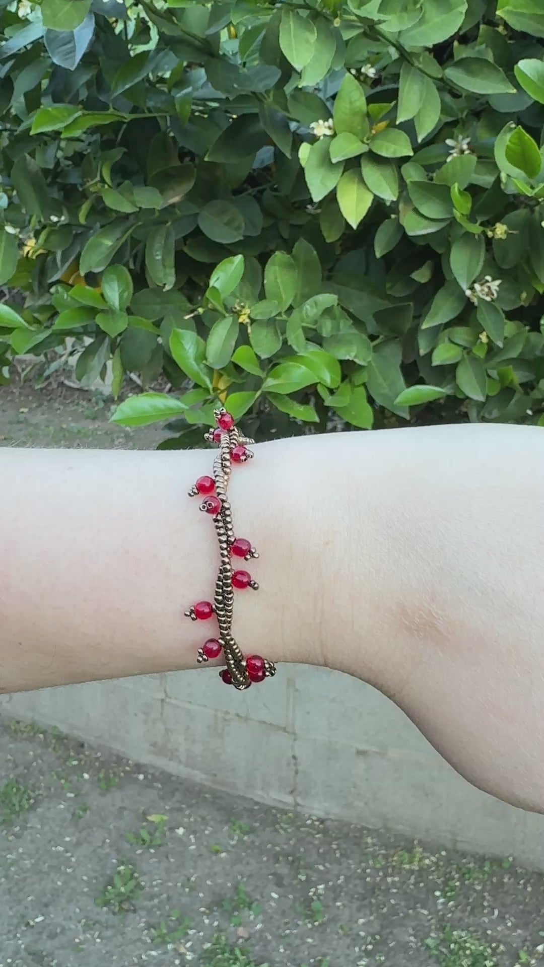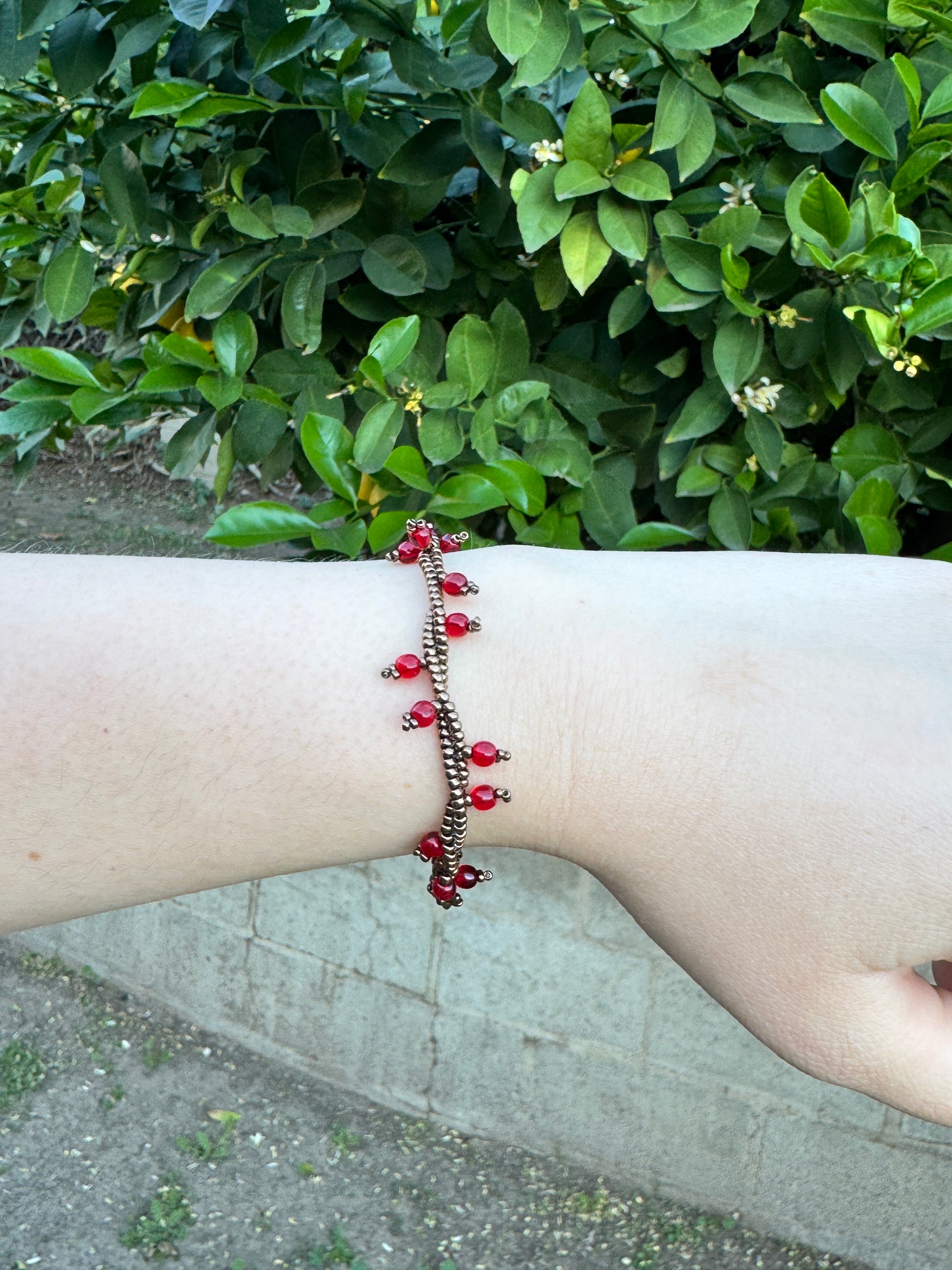 Hand-beaded with bronze seed beads and red Czech glass