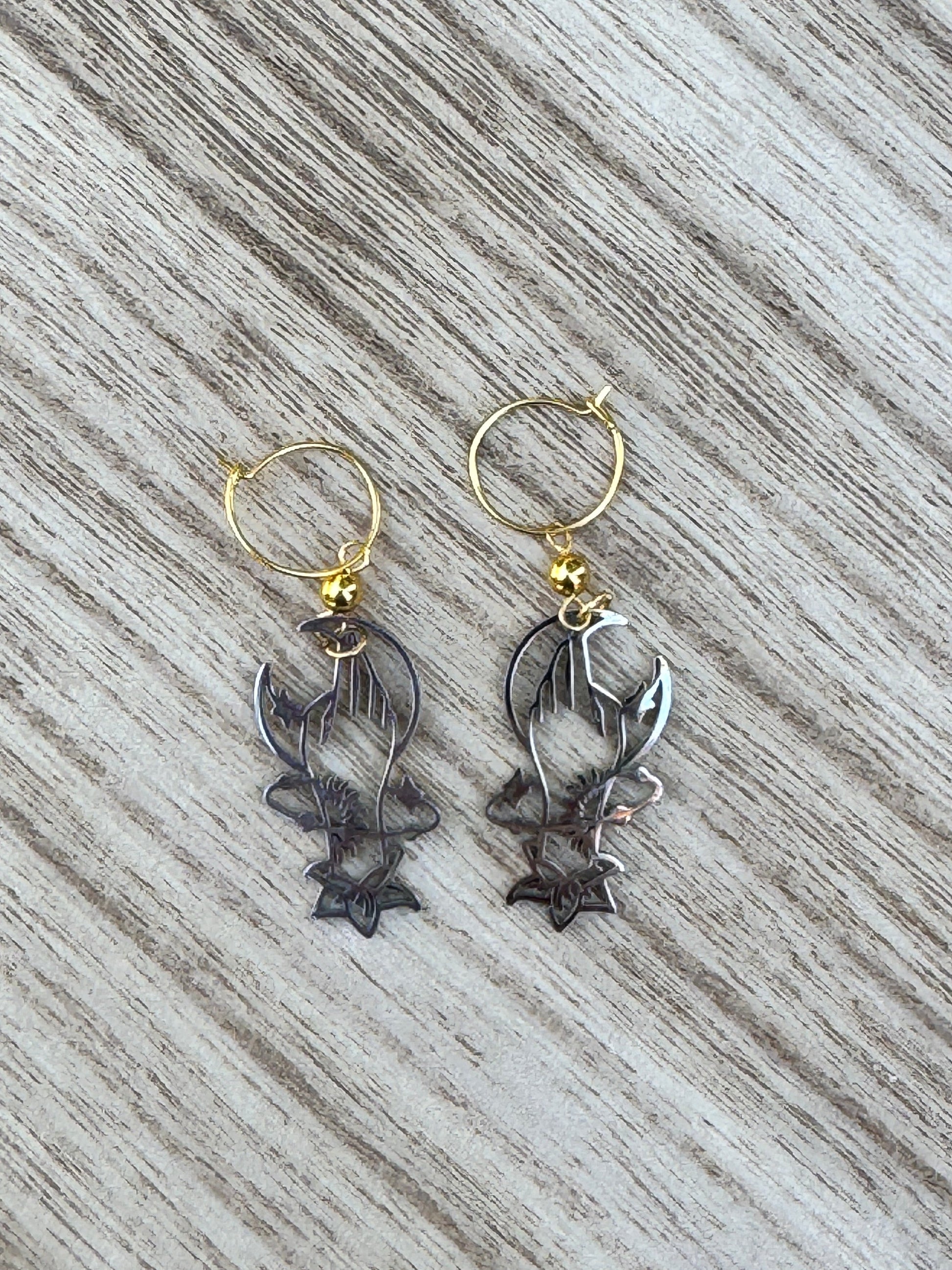 Bring a sprinkle of magic to your style with our Ethereal Embrace earrings. Featuring charming silver hands adorned with whimsical floral motifs, these delightful pieces dangle playfully from gold-plated hoops. Perfect for any occasion, they beautifully blend nature and celestial charm, letting you twirl through the day with the universe's enchantment at your fingertips!