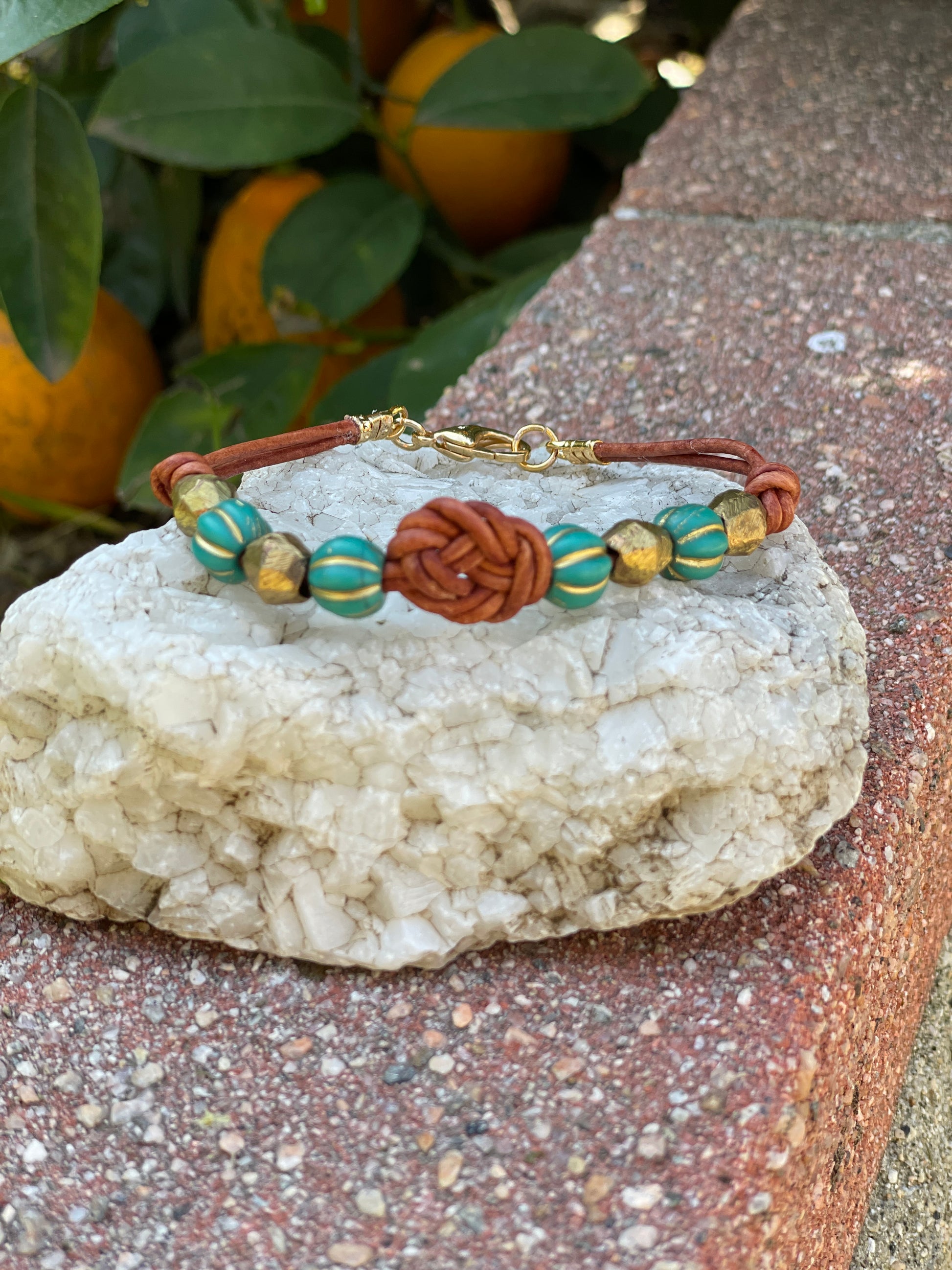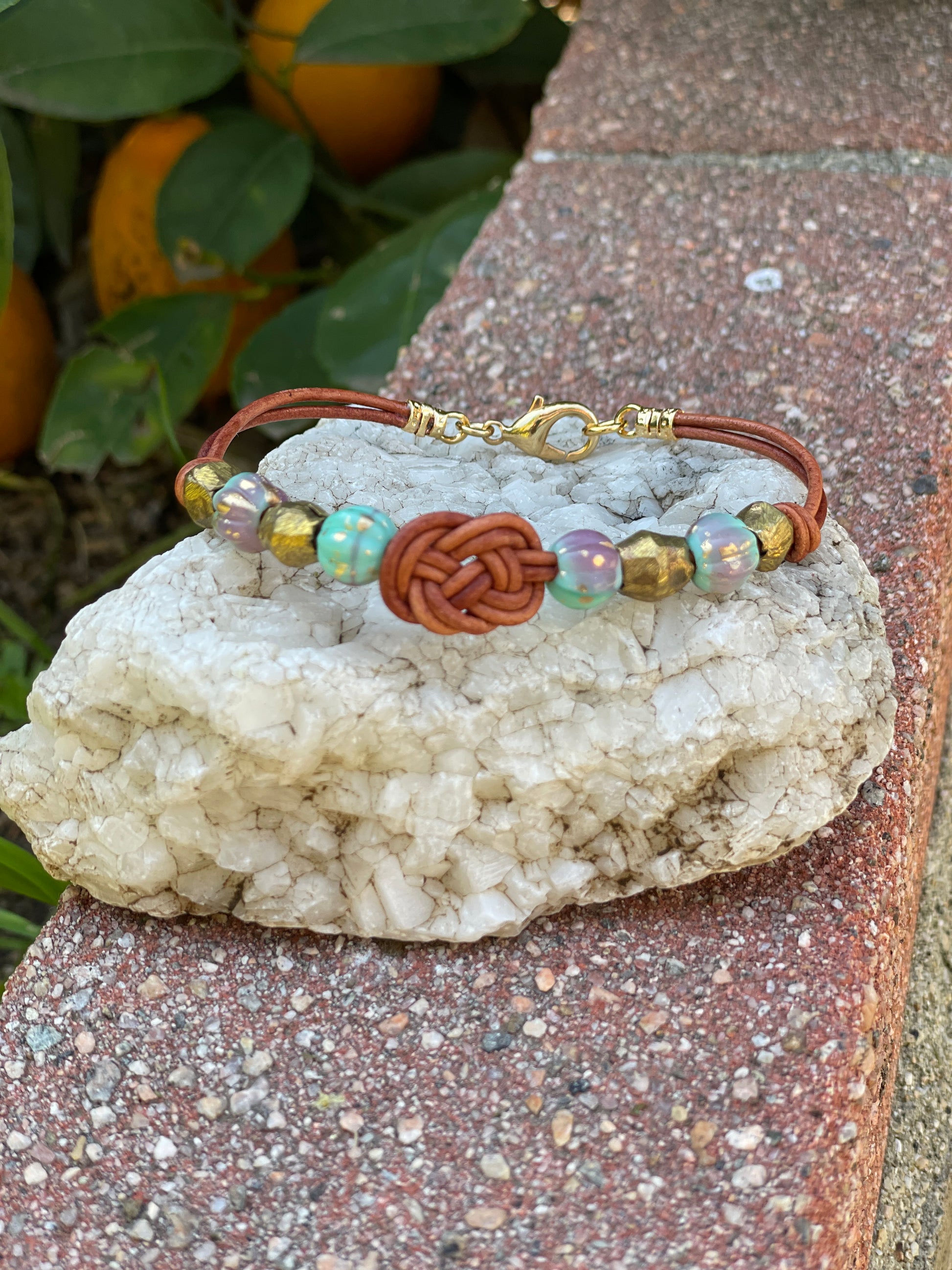 Unveil your bohemian side with our captivating bracelet, "Josephine's Spirit." Featuring a leather Josephine knot focal, accented by glass melon beads and Nigerian brass bicone metal beads, this bracelet exudes charm and playfulness. Perfect for adding a touch of whimsy to any outfit, "Josephine's Spirit" is your go-to accessory for embracing the carefree vibes of the boho lifestyle. Let your spirit soar and your style shine with this delightful piece adorning your wrist.