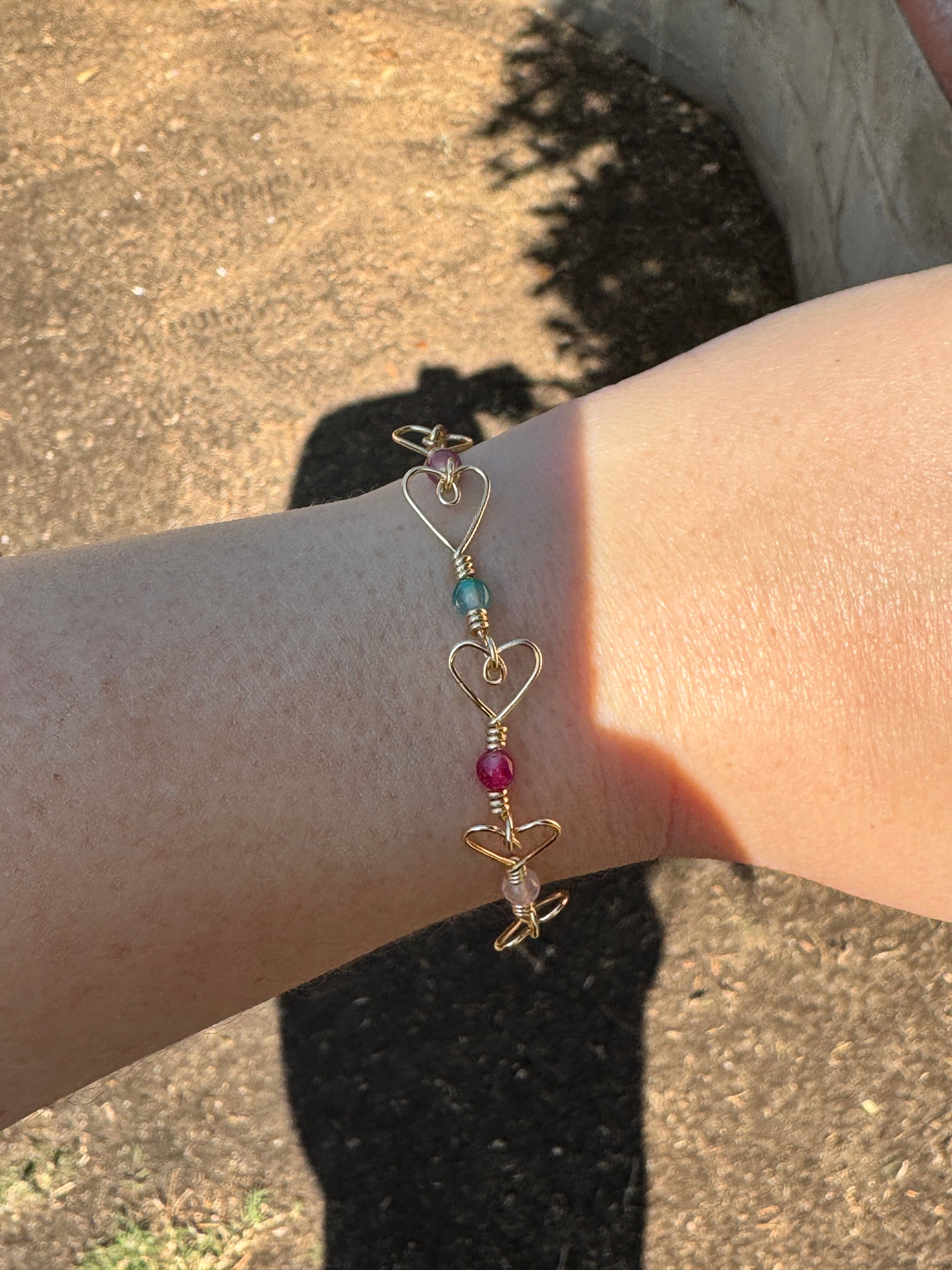 Intertwined hearts, crafted from gold plated copper wire and vibrant glass beads, make this bracelet a charming addition to any outfit. Hand-wired with love, it's the perfect gift for a loved one (or yourself)!