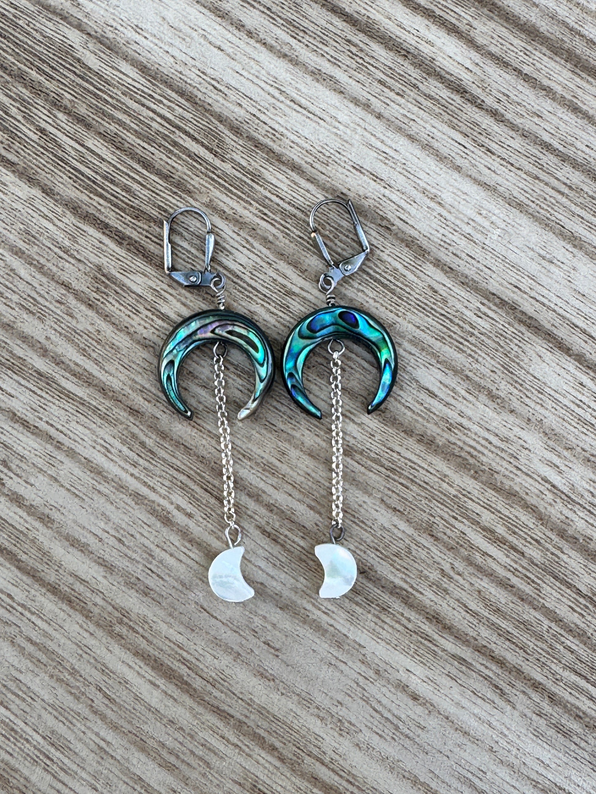 Dive into the enchanting world of Moonlit Tides! These delightful earrings showcase shimmering abalone crescents paired with whimsical mother of pearl moons, capturing the playful spirit of a magical night by the sea. Perfect for dreamers and ocean lovers alike, *Moonlit Tides* adds a touch of celestial charm to any outfit, inviting you to dance under the stars and embrace the beauty of the moonlit waves.