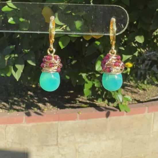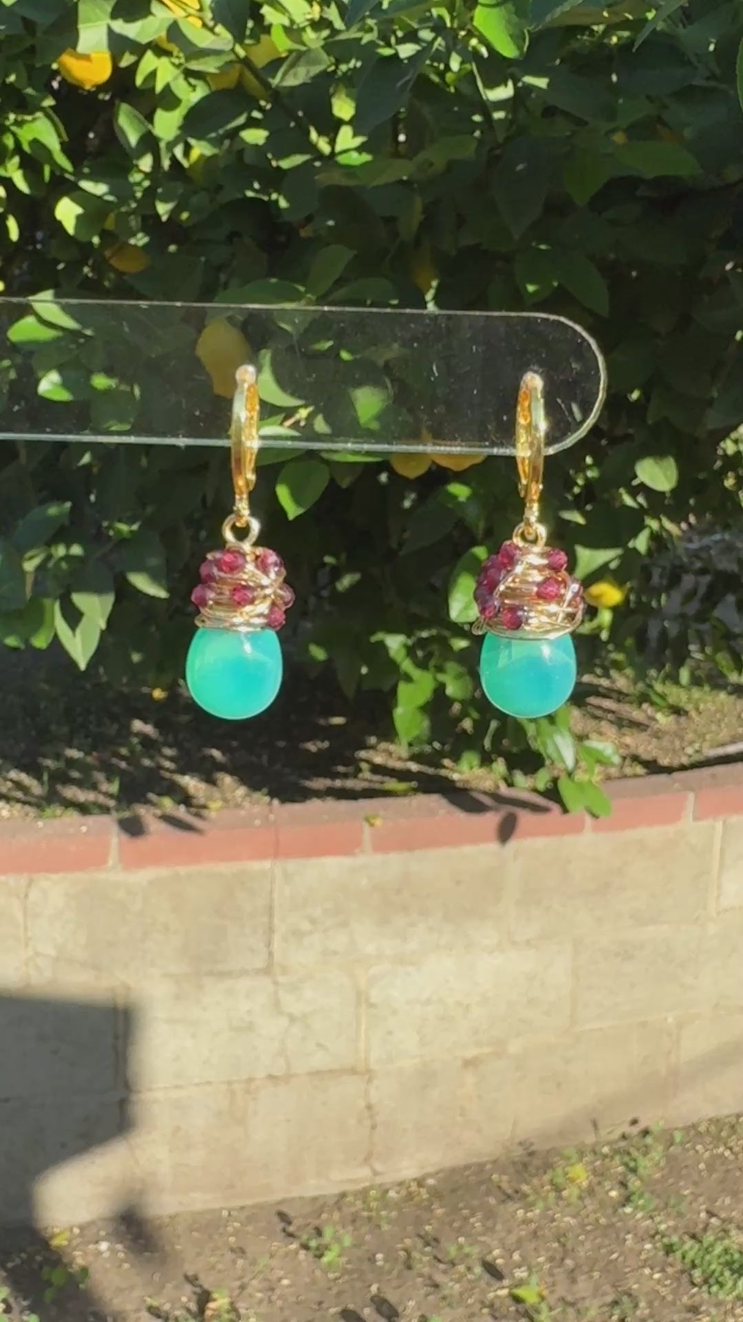 These earrings are small, but they do interesting things. A smooth green opal Czech glass drop anchors the design, wrapped in gold-plated wire and finished with deep garnet gemstone accents for contrast and warmth.
