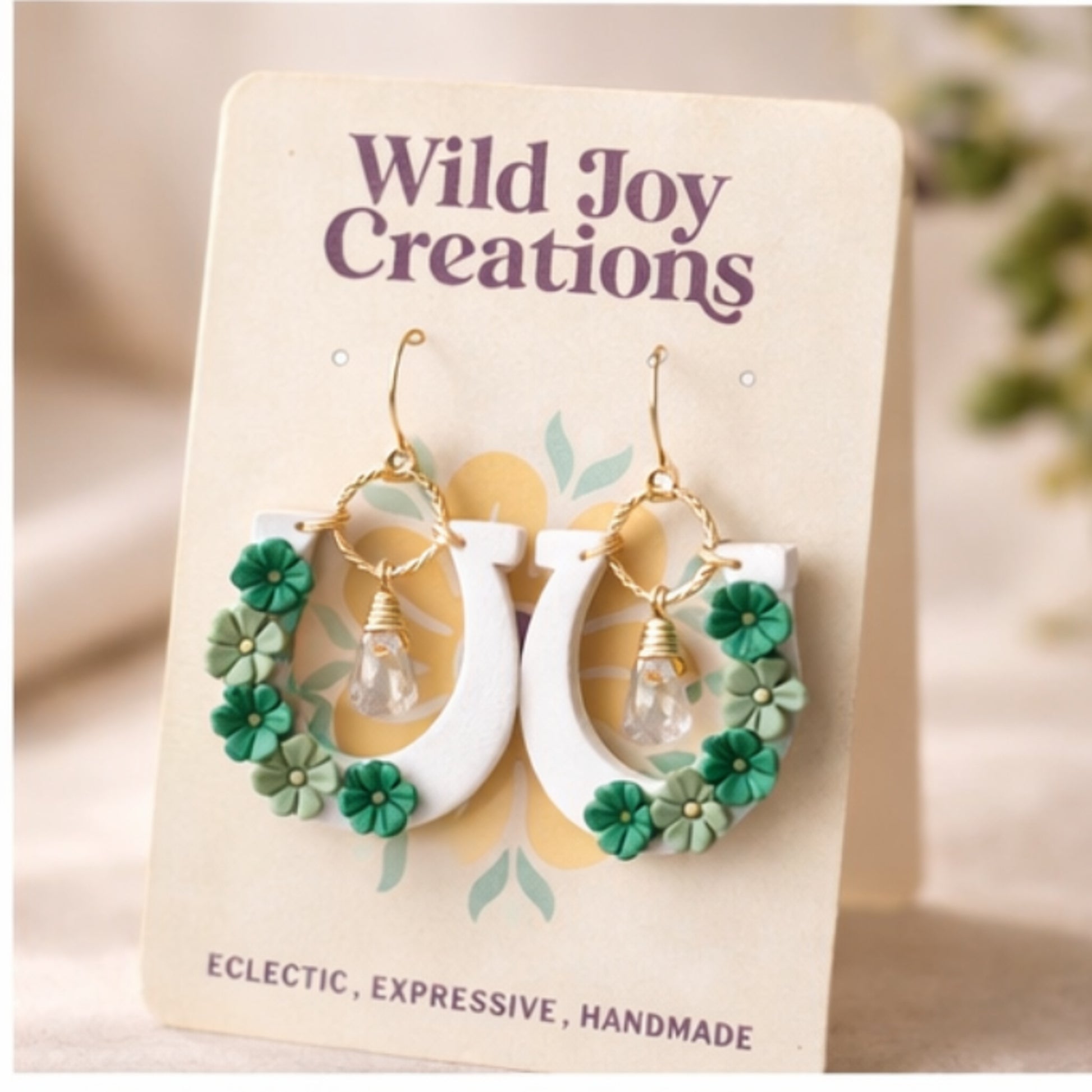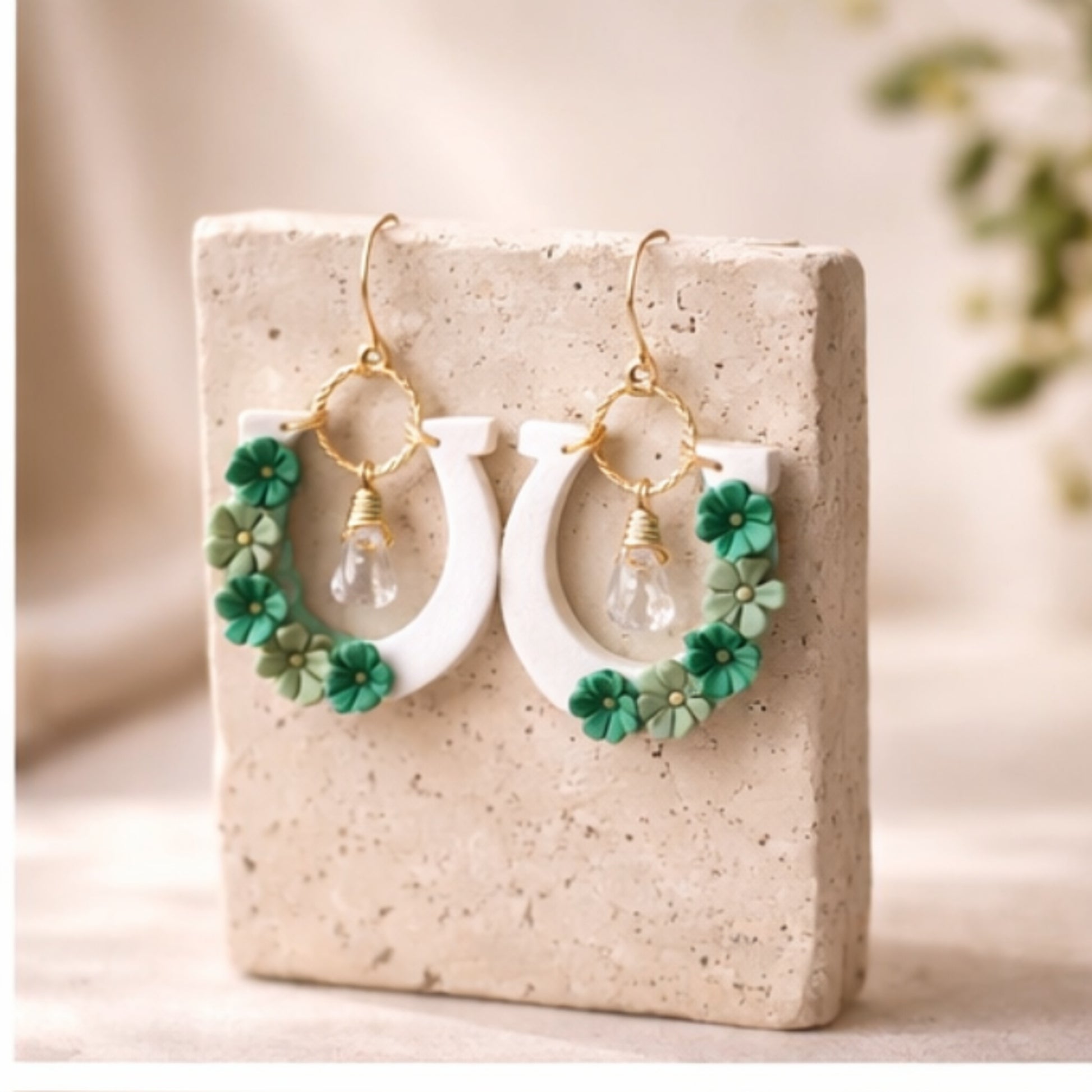These horseshoe-shaped earrings are made from polymer clay and finished with small green clovers that wrap along the curve. In the center, a hand-wrapped crystal drop catches the light as the earrings move — subtle, but noticeable.