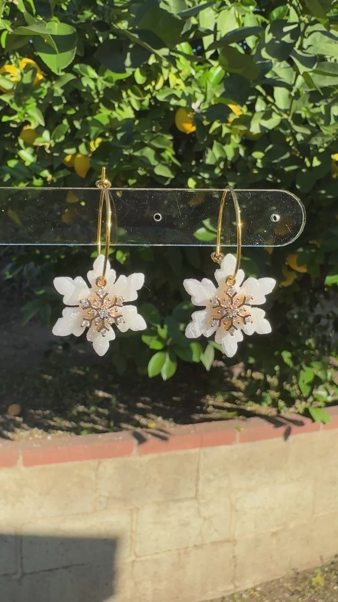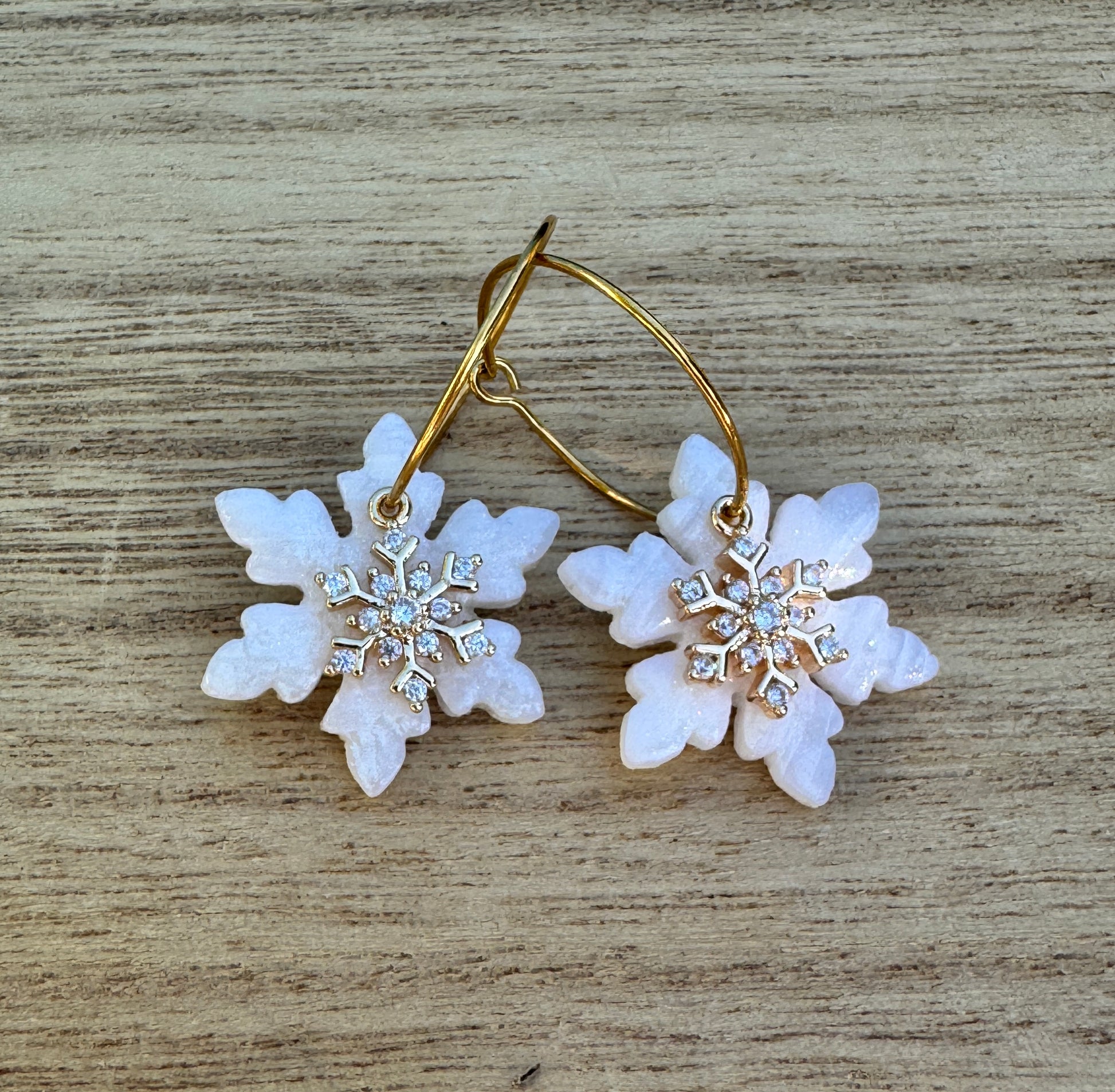 These earrings are for people who like winter sparkle without the noise. Translucent polymer clay snowflakes shimmer softly as they catch the light, paired with a gold-tone snowflake charm for just enough contrast and detail.